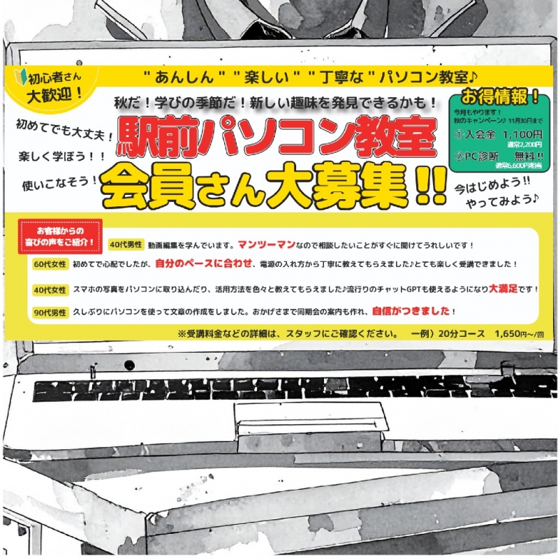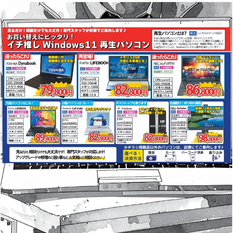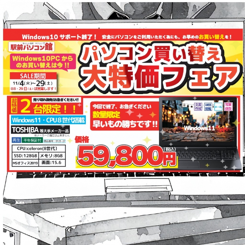 【パソコンセール】 post by TFCメディアラボ | On 2025.11.6 | in お知らせ 11月29日までパソコン買い替え大特価フェア開催中 ■■■Windows10サポート終了■■■ ウイルス感染リスク増!!! WEBサービスが利用できないトラブル増!! 乗り換えの設定は大得意♪ のお手伝いならお任せあれ。