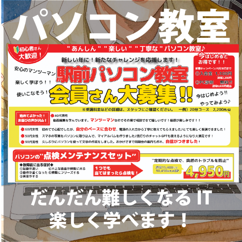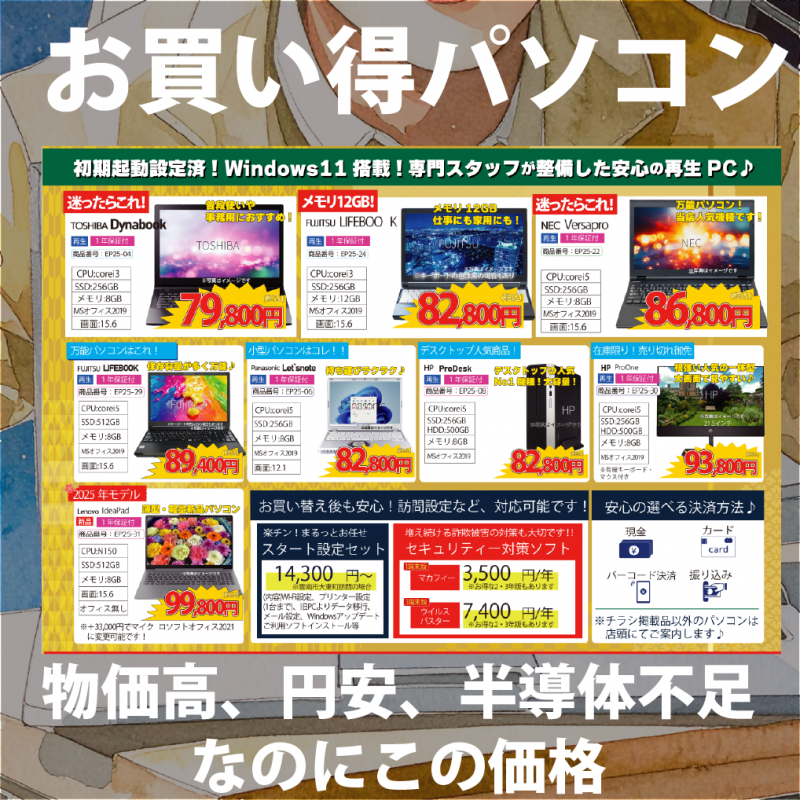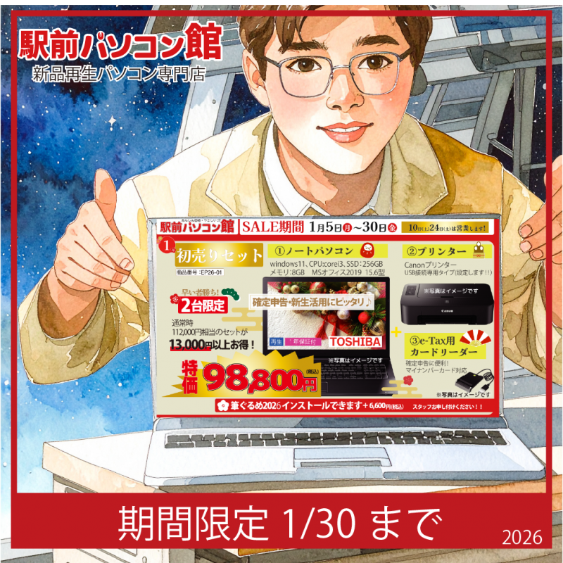 【パソコンセール】1月の売り出しについて post by TFCメディアラボ | On 2026.1.23 | in お知らせ 1月23日までパソコンが超お得にゲットできるチャンス! 物価高、円安、半導体不足なのにこの価格! ご購入はお早めに!