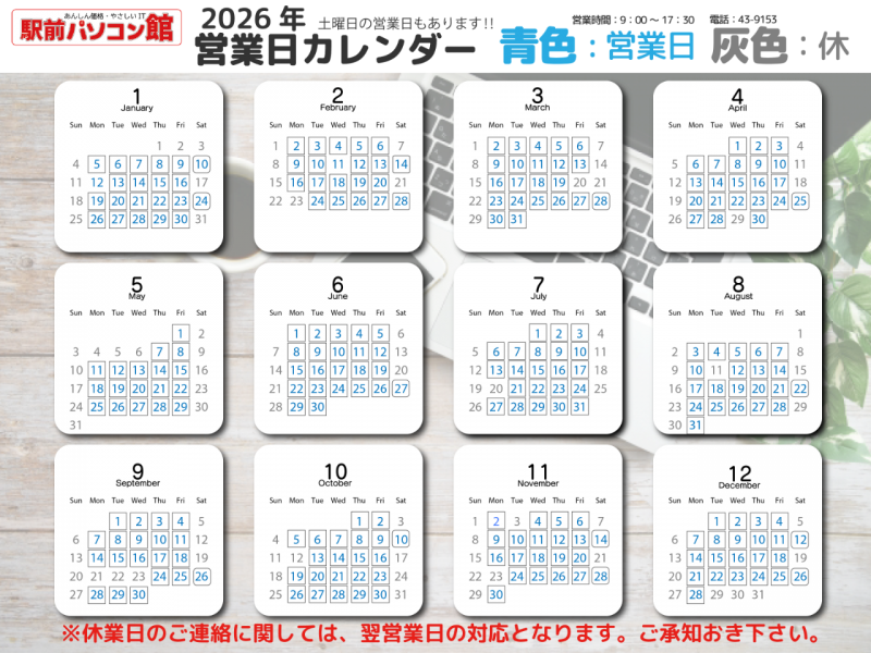 2026年版営業日カレンダー post by TFCメディアラボ | On 2026.2.24 | in お知らせ 駅前パソコン館の2026年営業日カレンダーです。 青色が営業日、灰色が休業日です。 ご来店・ご予約の際は事前にご確認ください。