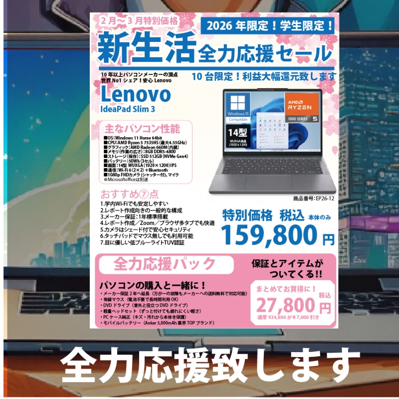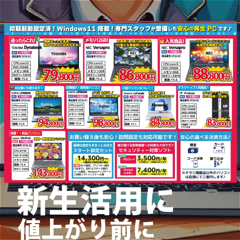 【パソコンセール】3月の売り出しについて post by TFCメディアラボ | On 2026.3.6 | in お知らせ 【パソコンセールやってるよー!】 3月の売り出し情報です。 3月31日までパソコンが超お得にゲットできるチャンス! 半導体価格が高騰中なのにこの価格! 修理もおすすめ! ご購入はお早めに!